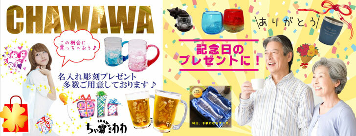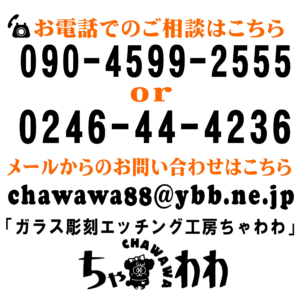 「ガラス彫刻エッチング工房ちゃわわ」は、福島県いわき市にて日本酒、焼酎、ウイスキー、ワイン、お酒グラスにサンドブラスト方式にて名入れ彫刻を施したオリジナルプレゼント”をネットショップにて製作・販売しております。皆様の大切な記念日の思い出に残るような贈り物をお届けします。