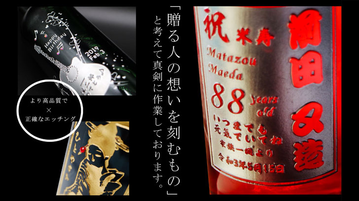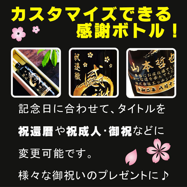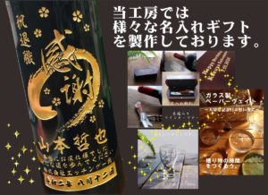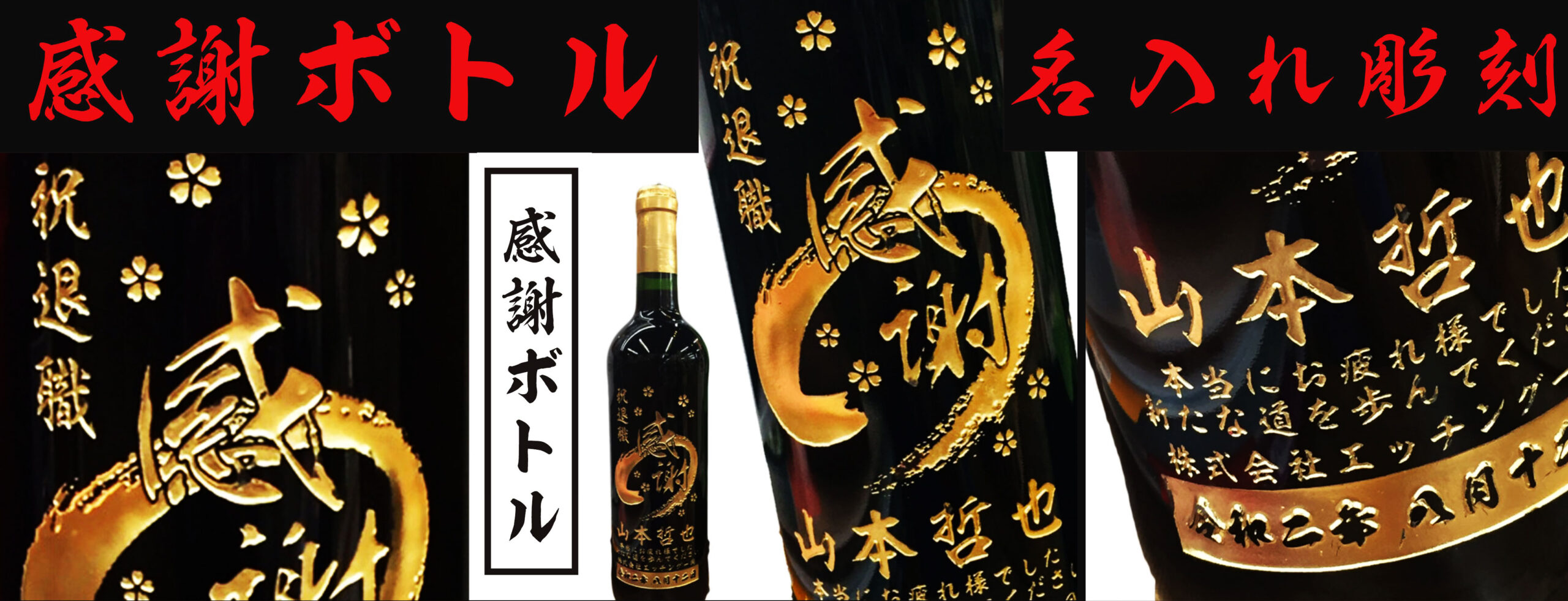 大切な記念日に喜ばれる「感謝ボトル」お名前・贈るメッセージ・記念日を彫刻します~還暦祝い、古希祝い、喜寿祝い、結婚祝い、退職祝い、成人祝い、誕生日プレゼントをはじめ、様々なお祝いの席を盛り上げます♪
