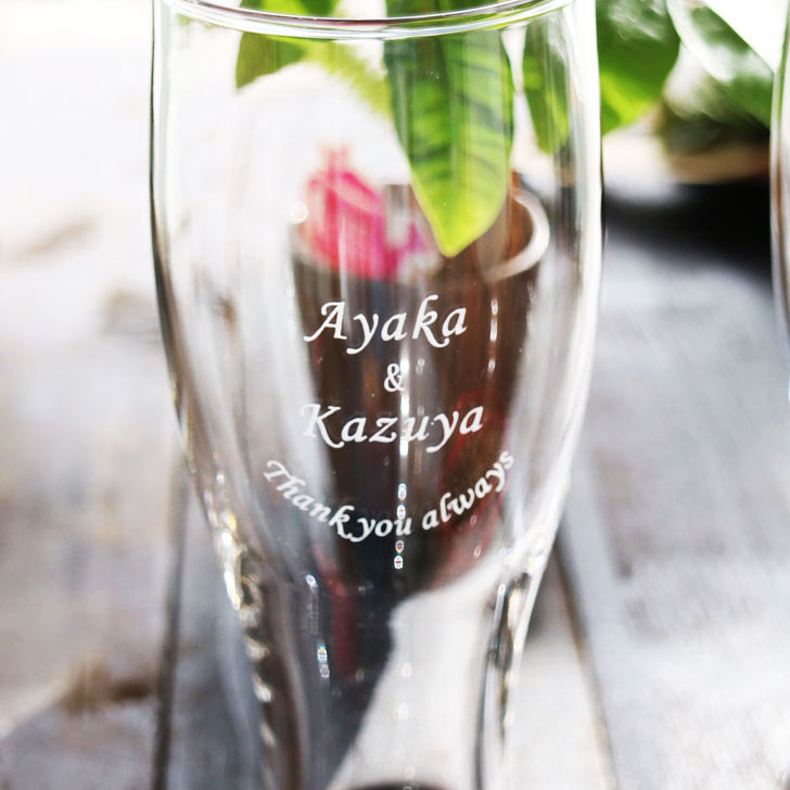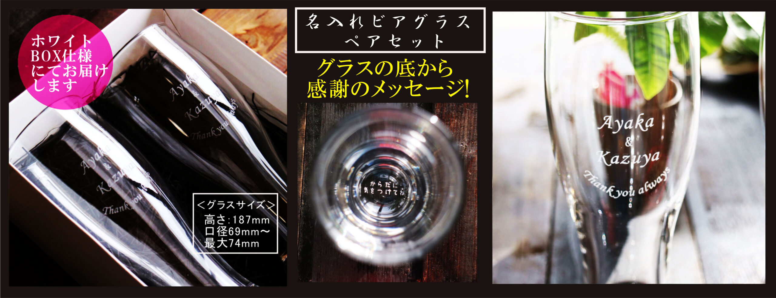 名入れビアグラス(420ml)に「お名前・贈るメッセージ」を彫刻します~飲み終えると・・・グラス底部より第2の贈る言葉が・・・