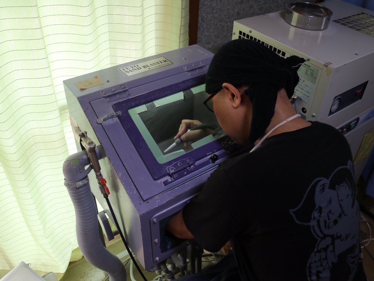 それからサンドブラストマシンへ入れてコンプレッサー圧にて専用の研磨材を噴射して彫っていきます。